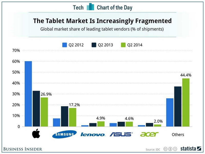 Doanh số iPad gần gây đã tụt dốc một cách đáng báo động. Theo thời báo kinh tế Business Insider, trong quý vừa rồi, doanh số của tablet từ Apple đã giảm 9% so với quý trước, xuống còn 13,3 triệu đơn vị được bán ra. Điều này nằm ngoài dự đoán của các nhà phân tích. Ngoài ra, thị phần của thiết bị cũng bị ảnh hưởng bởi các nhà sản xuất nhỏ lẻ với các mẫu mã rẻ hơn. Cụ thế, kết thúc quý 2 năm 2014, iPad chỉ chiếm 27% trên tổng doanh số tablet được bán ra thị trường. Câu hỏi được đặt ra, tại sao lại có sự sụt giảm đáng báo động dành cho iPad - thiết bị tới từ ông chủ Apple đã dành được sự tín nhiệm của người dùng vì những thiết kế độc đáo và dịch vụ ổn định?