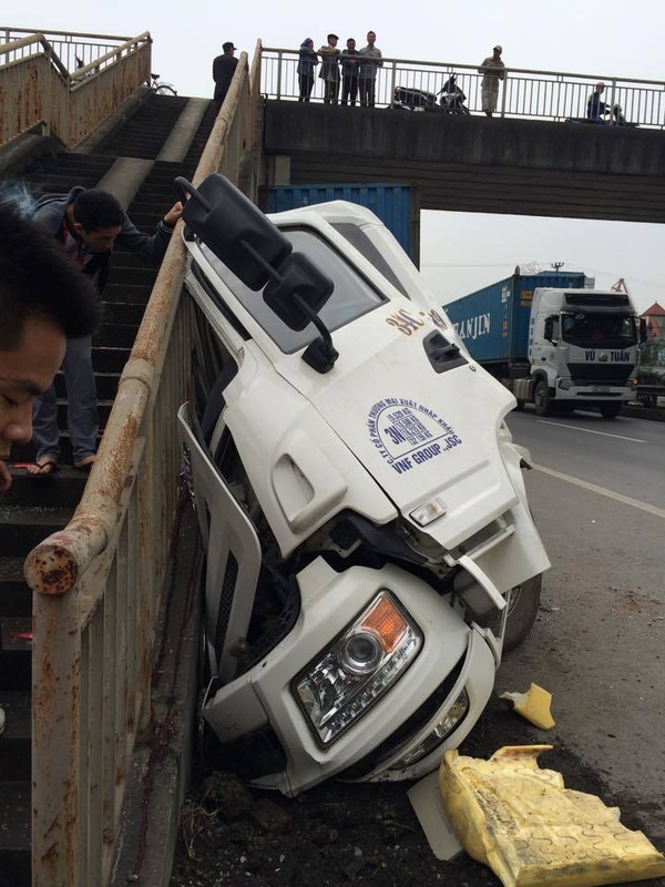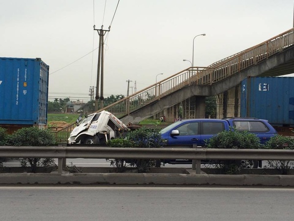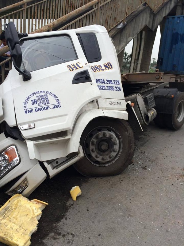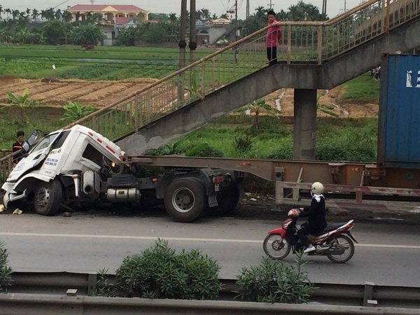 Khoảng 15h chiều ngày 8/4, một chiếc xe container lao vào thành chân cầu vượt Lê Thiện, trên đường quốc lộ 5, đoạn qua địa phận huyện An Dương, Hải Phòng.