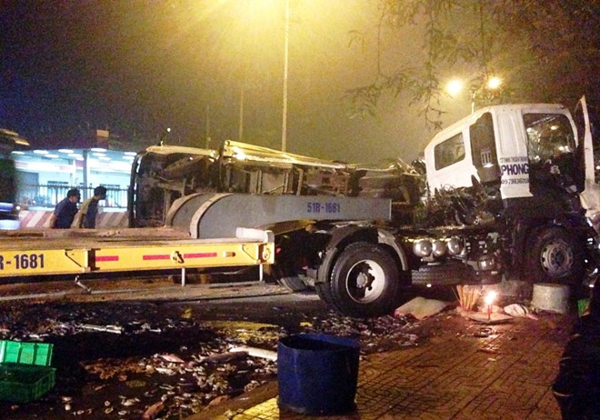 Tại hiện trường, xe tải chở hải sản bị lật, hư hỏng nặng. Xe đầu kéo vỡ nát phần đầu.